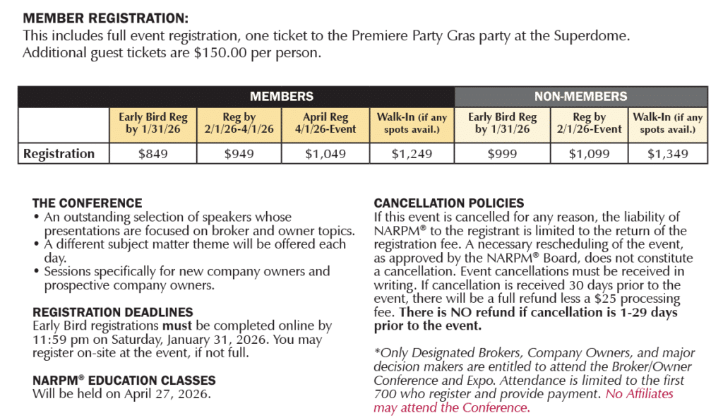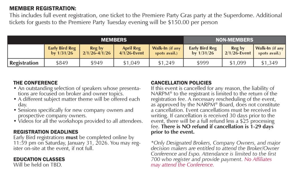 NARPM® does not sell participants' lists for NARPM®'s Capitol Summit, Broker/Owner Conference & Expo, or Annual Convention & Trade Show. Please disregard offers from entities selling such lists. NARPM® does not make these lists available for sale.